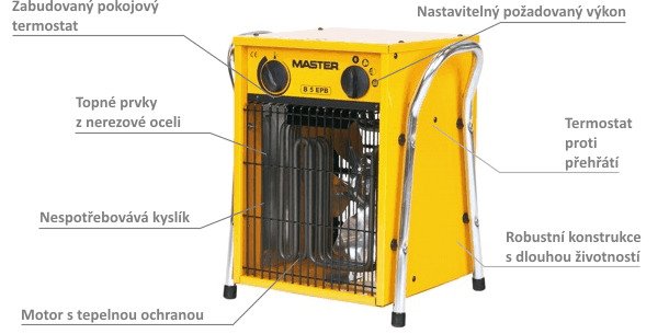 Elektrická topidla MASTER s ventilátory jsou vysoce výkonná zařízení se širokým spektrem použití. Topidlo produkuje čistý vzduch, topí rychle a bezpečně. Elektrická topidla jsou ideálním použitím pro dočasné využití nebo pro jiné mimořádné situace právě pro jejich snadné použití a přenos. Elektrická topidla Master jsou vybavena pouze certifikovanými a vysoce kvalitními komponenty, což zajišťuje jejich spolehlivost a výkon.